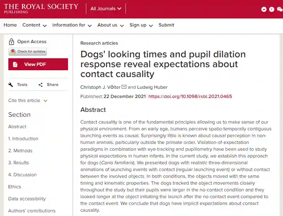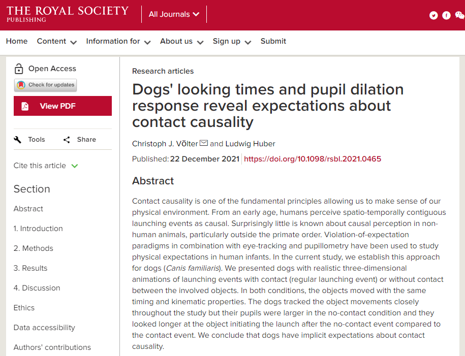 相关研究以“Dogs' looking times and pupil dilation response reveal expectations about contact causality”为题,发表在“Biology Letters”杂志上。
