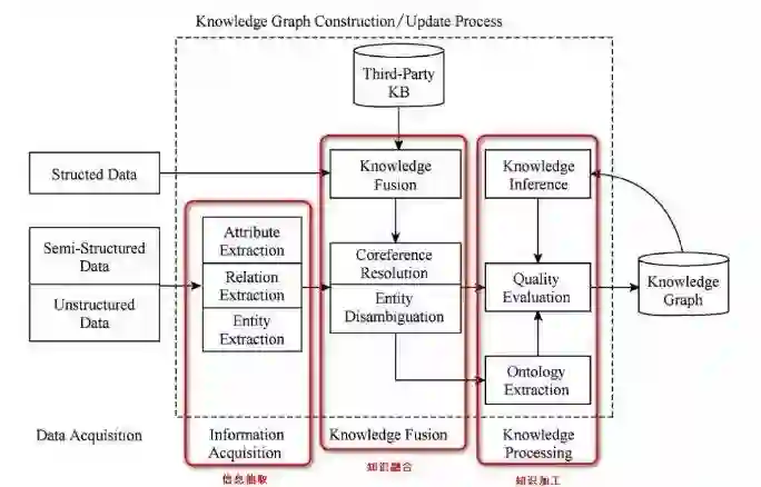 构建知识图谱是一个迭代更新的过程,根据知识获取的逻辑,每一轮迭代包含三个阶段: