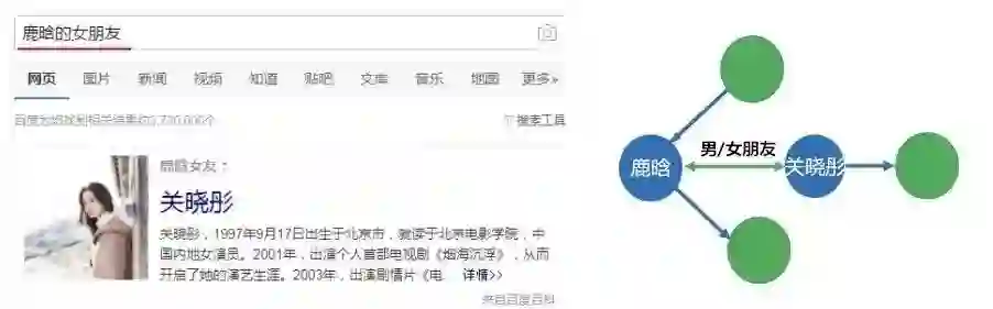 知识图谱应用的前提是已经构建好了知识图谱,也可以把它认为是一个知识库。这也是为什么它可以用来回答一些搜索相关问题的原因,比如在百度搜索引擎里输入“鹿晗的女朋友?”,我们直接可以得到答案-“关晓彤”。