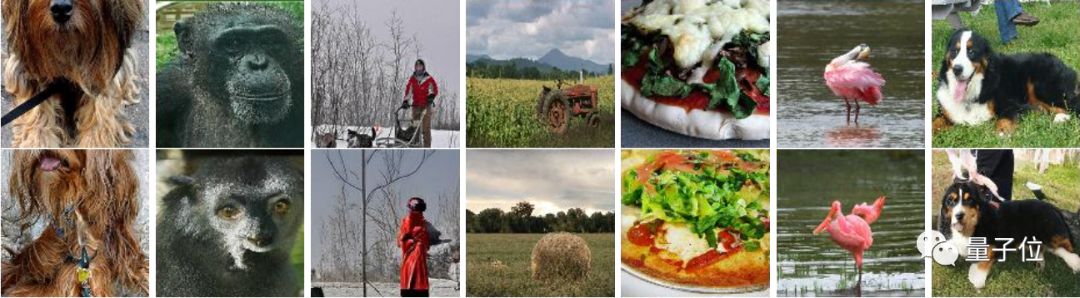 从无监督的BigBiGAN模型中选择的图像重建的结果。第一行是真实图像;第二行是根据上面图像x的重建图像。