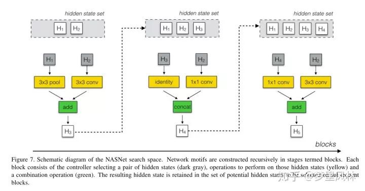 g的组合还可以包含LN和IN,NASNet-A是不包含的,NASNet-B和NASNet-C是包含的,NASNet-B更骚一点,整个cell最后组合的时候,把所有搜索的输出都concat进来了;