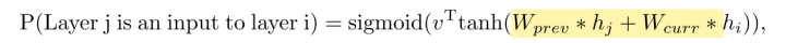 为了在layer之间增加skip connection,这篇论文还另外为第N层输出一个N-1的向量,这个向量的值代表是否要将前一层连进来作为input;连接prev层的概率如下计算: