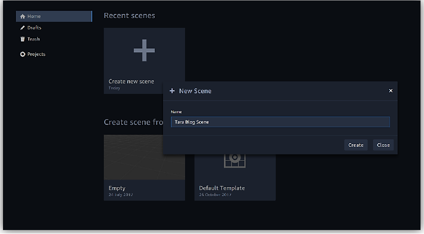 在 Sumerian仪表板中,只需按下按钮即可轻松创建一个新场景。