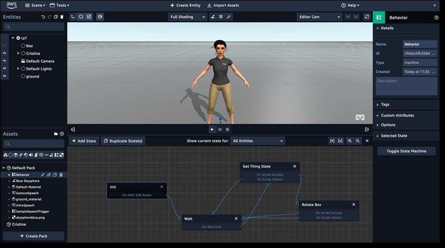利用状态机,可以通过选择事件所触发的操作并将其组织成状态来以可视化方式添加行为。将状态机添加到Cristine实体来对它及其子级进行动画处理。