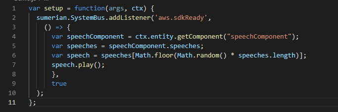 此脚本会等待AWS开发工具包加载并检索凭证。然后,它会获取对同一实体 (Host)上的语音组件的引用,并获取所有附加的语音列表。它从数组中选择语音并进行播放。