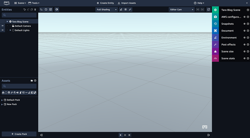 下面我们通过一个简单的例子来实现一个简易版VR应用,创建具有 Sumerian资产库、状态机动画并支持虚拟现实(VR)的场景。然后导入到Amazon Amplify创建的应用中实现闭环。