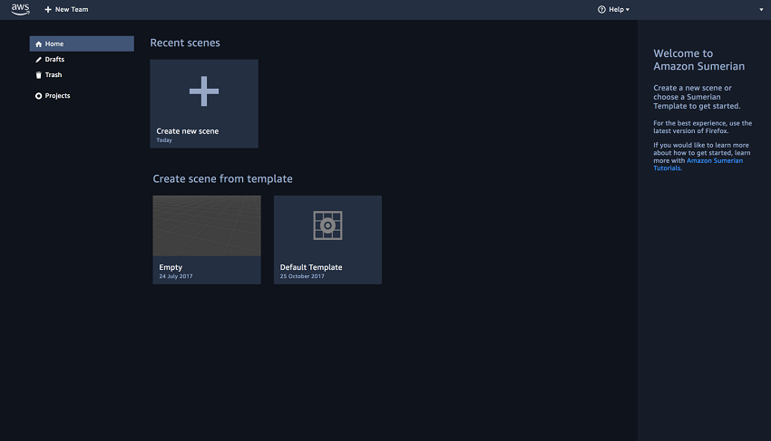 由于 Amazon Sumerian不要求具有3D图形制作或编程经验即可构建丰富的交互式VR和AR场景,因此让我们来快速使用Sumerian仪表板创建项目。
