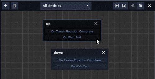 8、在状态机面板中,每个状态显示了两个事件,一个事件在动画结束时发生,另一个事件在等待操作结束时发生。单击等待结束事件up,然后将一条线拖动到沿向下状态。然后反方向执行相同的操作