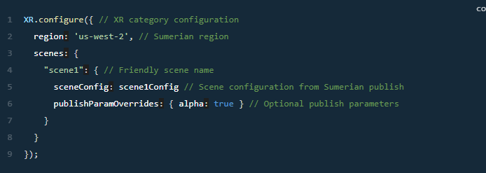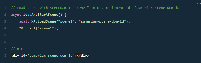 XR 类别允许使用方法将 Sumerian场景渲染为DIVHTML元素loadScene。加载场景后,XR.stARt()方法将启动场景。要渲染场景,请在方法调用中传递场景名称和元素的id: