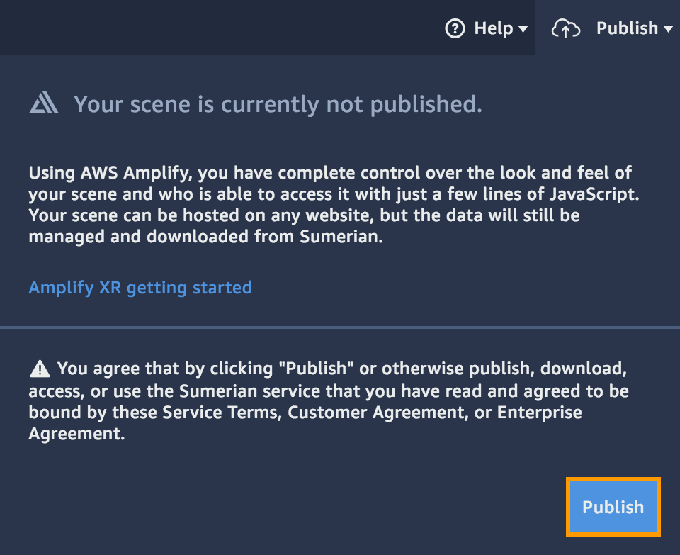 单击Sumerian控制台右上角的发布下拉菜单,然后单击私下托管: