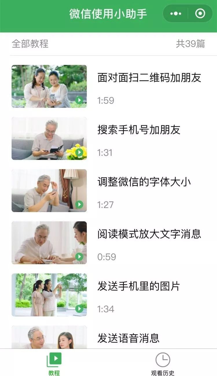 “这个简直棒,微信官方出品的,包含微信几乎所有核心场景的视频教程,真人上镜,口语解说,直接把视频列表分享给妈妈,完全不用我蹩脚的电话或手把手教学了。”