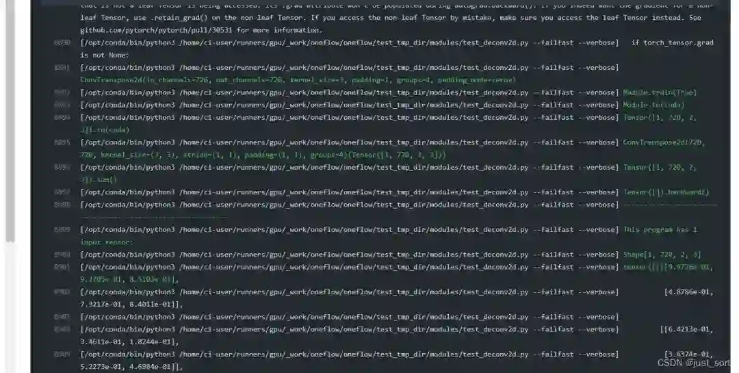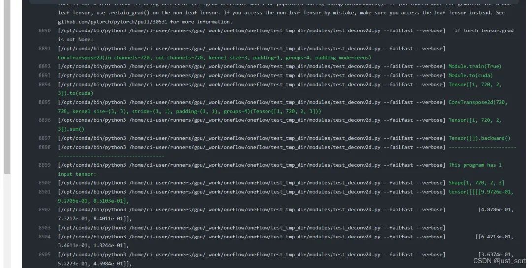 上面介绍完了AutoTest框架的原理和使用方法,这里再展示一下基于AutoTest框架如何拿到可复现BUG的程序以及对应的输入tensor和参数等。原理很简单,就是把GetDualObject过程中使用的 api 记录下来拼起来就构成一个完整的程序,这里展示一下在 CI 中的效果。https://github.com/Oneflow-Inc/oneflow/runs/4760189461?check_suite_focus=true 这个例子展示了在某次CI过程中,OneFlow的 conv_transpose2d 算子和 PyTorch 的 conv_transpose2d 算子在某个 case 下没有对齐,那么 CI 在报告这个错误时也输出了对应的复现代码和数据,可以方便框架开发者进行定位和判断: