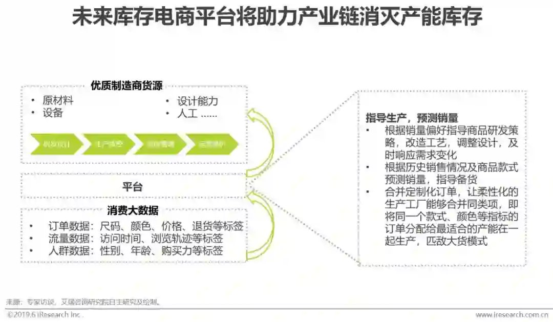 未来平台货品将从成品库存向产能库存转变:随着供给侧改革不断深入开展,服装行业的产业结构、产品结构、创新水平都有一定程度的提升。例如,新兴的C2M模式会借助消费者需求指引生产 ,去除中间流通环节,使商品库存趋于“零”。所以未来的库存压力将不再是成品库存,而是供应链上游的过剩产能。未来平台将不只是一种销售渠道,还会利用大数据与平台算法,指导工厂的生产预测,同时将消费者的需求以订单的形式分配给最适合的生产商。