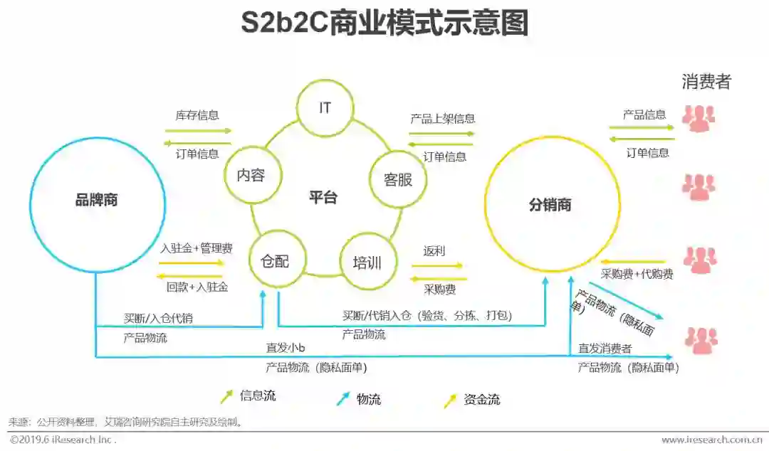 S2b2C模式是由S(供应商)、小b(分销商)和C(消费者)三方构建一张协同网络:这个过程中S和b紧密合作,一起服务于C端消费者。库存电商的S2b2C模式是指,上游品牌商的库存和订单的ERP系统与分销平台的交付系统链接,分销平台则服务于下游小b端分销商,为其提供可靠的货源,丰富的播货素材和完备的配套服务,最终分销商通过社群营销触达终端消费者。
