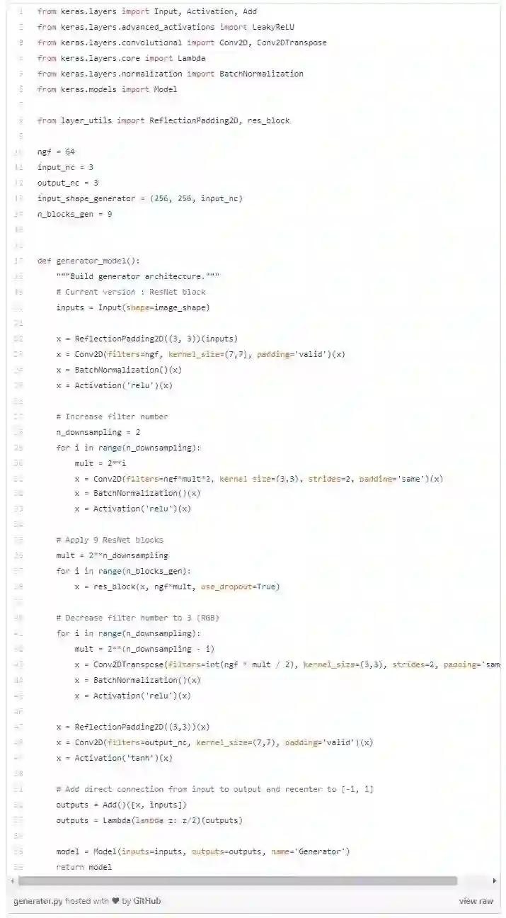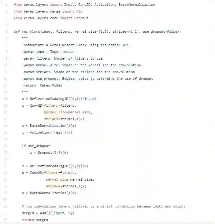 核心是采用9个ResNet blocks对原始图像进行上采样。来看一下Keras上的实现!