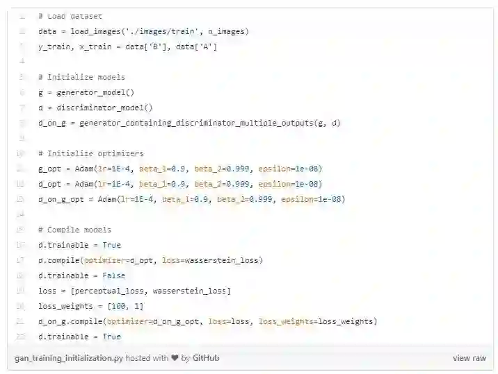 第一步是加载数据并初始化模型。我们使用自定义函数加载数据集,然后对模型使用 Adam 优化器。我们设置 Keras 可训练选项来防止判别器进行训练。