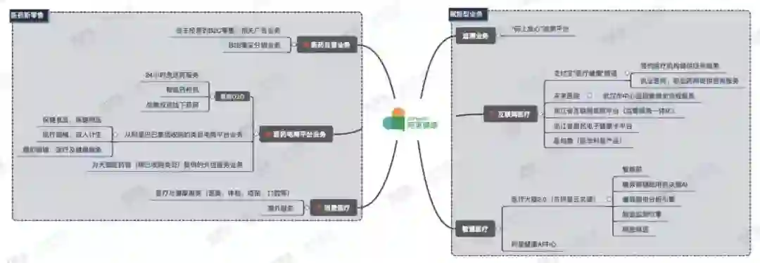 在阿里健康的新零售商业布局中,线上包括了自营业务和平台业务,线下是战投药店、合作药店与O2O送药服务,串联起来的则是实体医院或互联网医院。