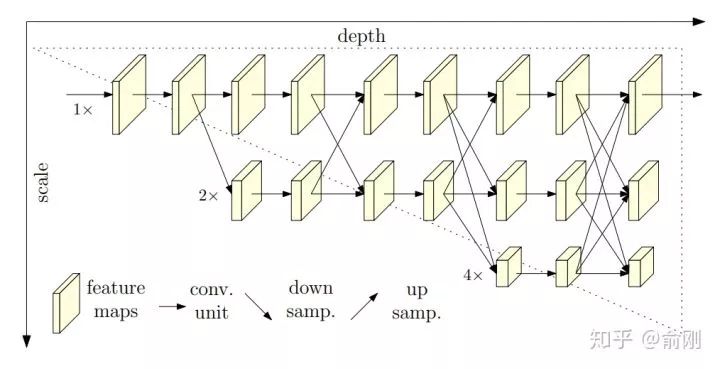 相比传统的下采样的网络结构,这里提出了一种新的结构。分成多个层级,但是始终保留着最精细的spaital那一层的信息,通过fuse下采样然后做上采样的层,来获得更多的context以及语义层面的信息(比如更大的感受野)。从结果上面来看,在COCO test-dev上面单模型可以达到75.5。