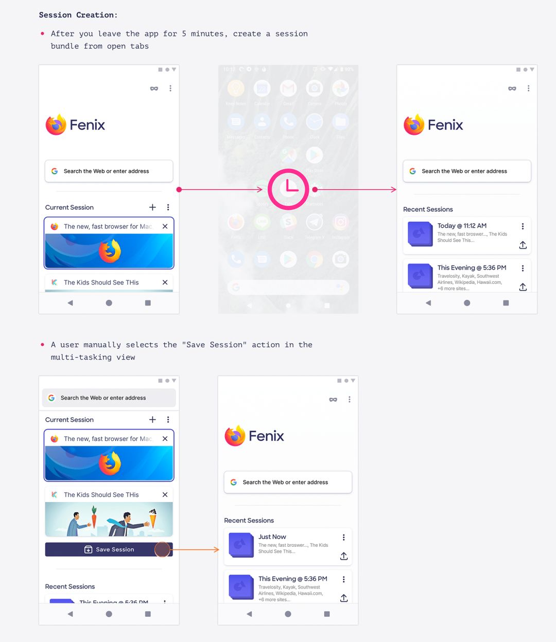 当浏览完并关闭浏览器后,这些选项卡将保存在称为会话的捆绑包中。也就是说,当再次返回 Fenix 时,可以启动一个新的浏览会话或返回到已经启动的会话。当前使用的各个选项卡可以全宽显示,可以手动保存为会话。