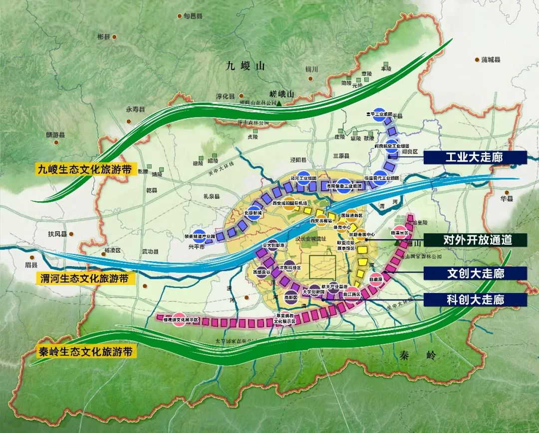 文创大走廊:以曲江新区为引领“曲江新区+丰镐遗址+楼观道文化展示区+白鹿原+临潼景区”等区域为依托的文化产业大走廊,打造“文化产业增长极”,发展万亿级文化旅游产业。