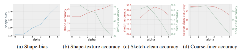 关于形状-纹理的初步讨论表明,人类更多地依赖于形状特征,而CNN更多地依赖于纹理特征,增加形状这种高级语义信息可以提高模型的准确性和鲁棒性,然而增大形状并不总是能够提升模型的鲁棒性。因此,作者从不同的分类粒度的角度研究了ImageNet数据集中狗的图片粗粒度和细粒度下的准确率(图 d ),对于粗粒度分类,只关注图像是否为狗类,而不关心具体是哪个种类的狗,而对于细粒度分类而言,只有预测为目标种类的狗的样本才被视为预测正确。从图 d 可以看到,随着形状特征的增加,细粒度预测准确率出现更为明显的下降趋势,因此,像 ImageNet 这种细粒度分类的数据集而言,偏好纹理这种底层特征的模型能够有较高的准确度。在论文附录中,作者也展示出了仅靠几个纹理特征就可以实现模型较高的准确度。