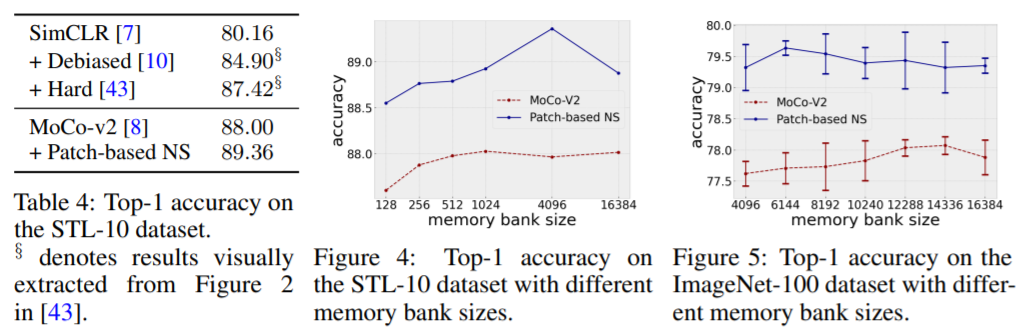 可以看到,无论 memory bank 大小如何改变,基于patch生成的弱语义负样本训练的模型都有较好的准确率,证明了弱语义负样本可以有效缓解上述问题。
