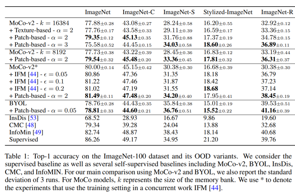 作者在 ImageNet 和 ImageNet-100 数据集上分别用两种对比学习模型 MoCo 和 BYOL 对上述两种生成方法生成的弱语义负样本做了实验,用在域外数据集(out-of-domain, OOD包括ImageNet-C(orruption)、ImageNet-S(ketch)、Stylized-ImageNet和ImageNet-R(endition))上的准确度(accuracy)作为评估模型在领域偏移(domain shift)的鲁棒性。基于patch的负样本生成方法中,patch大小 服从 的均匀分布。实验结果如下: