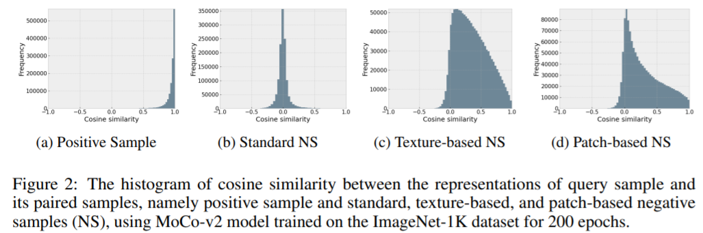可以看到,大部分正样本对和负样本对的相似度都接近1和0,平均相似度分别为0.94257和0.00018,而基于纹理和基于patch方法生成的负样本对,其相似度分布并没有像前两者那么集中于某个点,而是分布在0~1之间,用作者的话来说,呈现出“heavy tail”的分布,平均相似度分别为0.35248和0.29503。