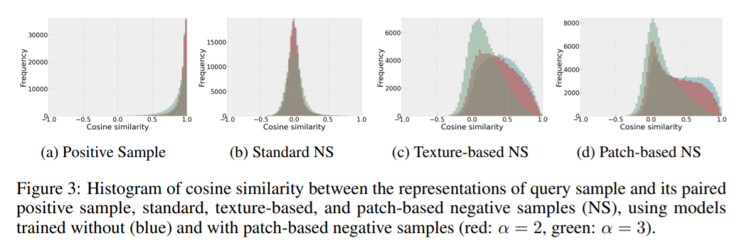 和图2类似,作者给出了是否使用基于patch的方法生成的负样本参与模型训练的样本相似度分布情况。蓝色曲线表示的是没有使用弱语义负样本训练的结果,红色和绿色曲线表示的是使用不同的 下弱语义负样本训练的结果。可以看到,在模型训练过程中加入弱语义负样本,可以降低原始样本和弱语义样本的相似度,说明模型降低了对底层特征的依赖,学到了更多高级语义特征,此外,随着 的增大,无论是基于纹理还是基于patch生成的弱语义负样本,两者的平均相似度也随之降低,但整体来看,基于patch的方法降低程度更为明显。