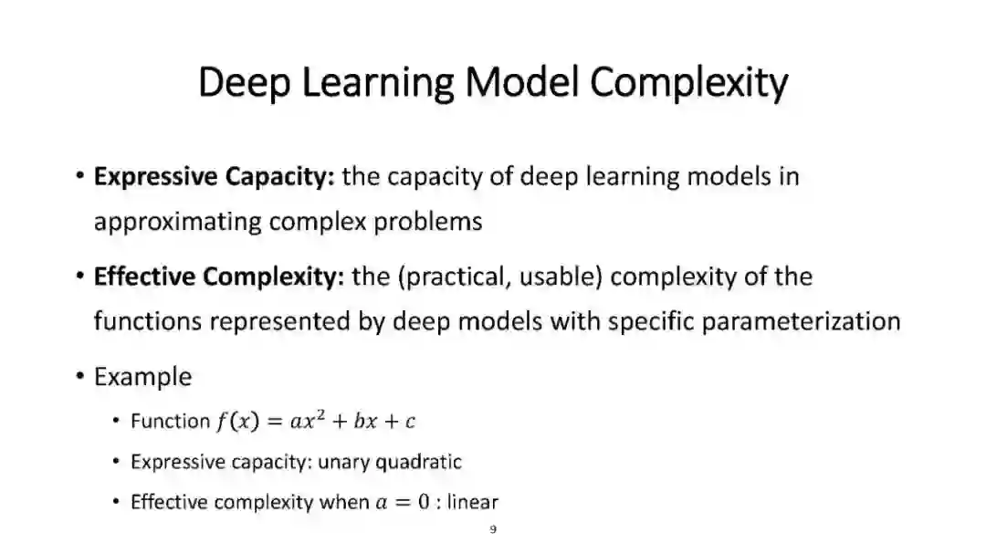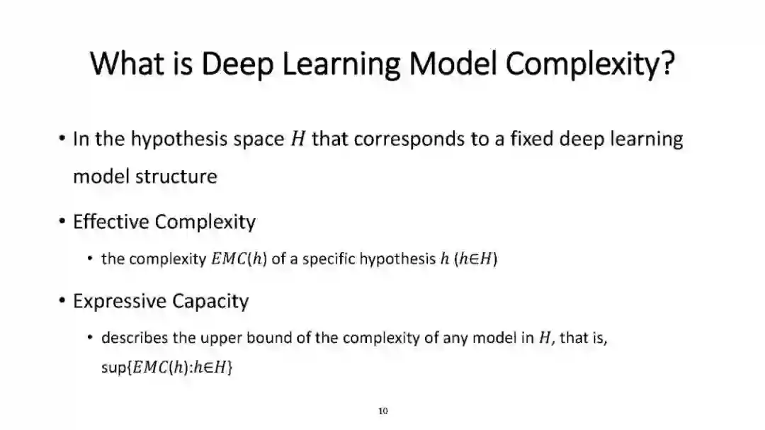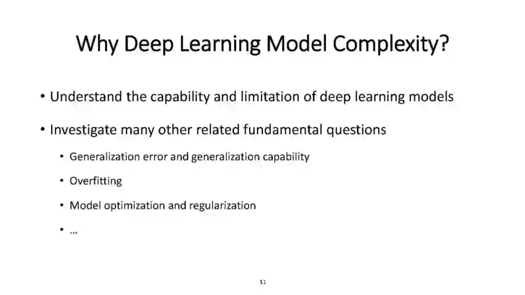 我们提出这个教程来概述关于深度学习模型复杂性的最新研究。本文将模型复杂性研究分为模型表达能力和有效模型复杂性两个方向,并对这两个方向的最新进展进行了综述。此外,我们还介绍了深度学习模型复杂性的一些应用实例,以说明其实用性。