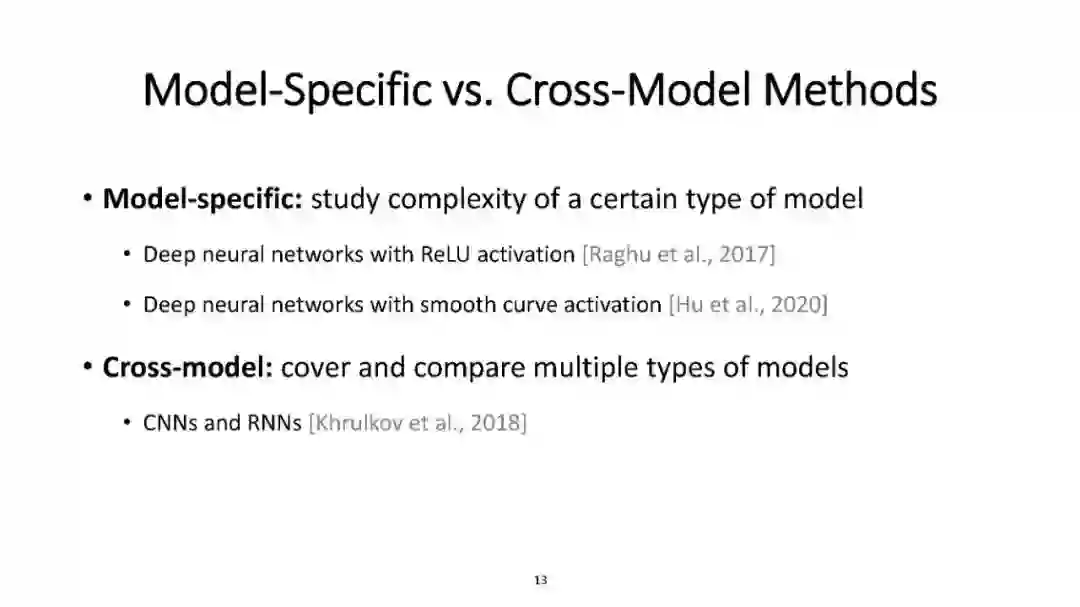 深度学习的模型复杂性关注的是,对于某种深度学习体系结构,深度学习模型能够表达多复杂的问题[15,44,70,89]。理解深度模型的复杂性是准确理解模型的能力和局限性的关键。探索模型复杂性不仅是理解深度模型本身的必要条件,也是研究许多其他相关基本问题的必要条件。例如,从统计学习理论的观点来看,利用模型的表达能力来限制泛化误差[69]。最近一些研究提出了基于范数的模型复杂度[60]和基于灵敏度的模型复杂度[76,81]来探讨深度模型的泛化能力。此外,在训练过程中检测模型复杂性的变化可以为理解和提高模型优化和正则化的性能提供见解[44,74,89]。