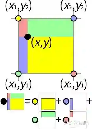 构成一个单位正方形, 四个小矩形的面积之和是 1 , 每个像素对应的权重系数是与它颜色相同的矩 形的面积。比如当 越靠近左上角黄色的点 时, 右下方黄色矩形的面积就会越大, 从而 像素获得的权重也就越大。