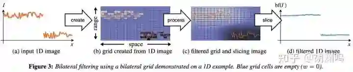上图中最左边输入的是一维的信号,它的两段之间有一个明显的间断(即边缘)。提升为二维网格(左边第二张图)后,它们变成图像中两个不连通的区域。如果对这个图像作二维的高斯滤波的话,由于两个区域间断处的像素距离比较远,所以它们在滤波时给对方贡献的权重很小,甚至没有,所以双边网格是可以保持边缘信息的。当然,上面这张图是为了画图简便,采用了一维信号作为输入,所以 Grid 是二维的;在我们的情况中,输入是二维的,Grid 就是三维的。