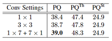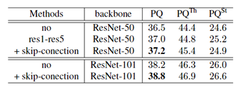 为提高网络全景预测效果,旷视研究员对各环节进行了分析与实验。首先,研究员对背景分割分支的监督信号进行了剥离实验,如表 1 所示。实验表明,同时进行 Object 类别与 Stuff 类别的监督训练,可为背景分割提供更多的上下文信息,改进预测结果。