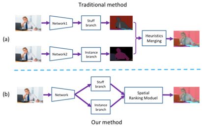全景分割是场景理解之中一个充满挑战的课题。先前的全景分割方法通常包含三个独立的组件:1)前景分割模块; 2)背景分割模块以及 3)融合(merging)模块。如图 1(a)所示。