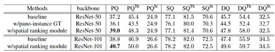 为验证空间排序模块算法的有效性,研究员在不同的基础模型下进行了实验,如表 3 所示。其中,w/ spatial ranking module 表示使用论文提出的空间排序模块得到的结果,从实验结果中可以看到,空间排序模块能够在不同的基础模型下大幅提高全景分割的评测结果。