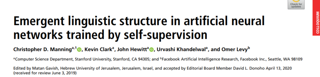 本文探讨了大型人工神经网络学习的语言结构知识,通过自监督训练,该模型简单地尝试预测给定上下文中的一个掩蔽词。人类的语言交流是通过词语序列进行的,但是语言理解需要构建丰富的从未被明确观察到的层次结构。这一机制一直是人类语言习得的一个主要奥秘,而工程工作主要是通过在树堆上有监督的句子学习来完成的,这些句子是手写标记的这种潜在结构。然而,我们证明,现代的深度语境化语言模型在没有任何明确监督的情况下学习这种语言结构。我们开发了识别人工神经网络中涌现的语言层次结构的方法,并证明了这些模型中的组件关注于语法关系和回指共指。事实上,我们表明,在这些模型中学习的嵌入的线性转换捕获了解析树的距离,达到了令人惊讶的程度,允许大致重建通常由语言学家假定的句子树结构。这些结果有助于解释为什么这些模型在许多语言理解任务中带来了如此大的改进。