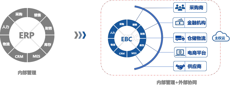 这两者的主要区别是,ERP管理系统侧重资源、计划等企业内部的资源管理,而EBC系统则更强调数据驱动,从客户角度出发,赋予其协同作业、主权云部署、IOT互联等外部业务拓展能力。