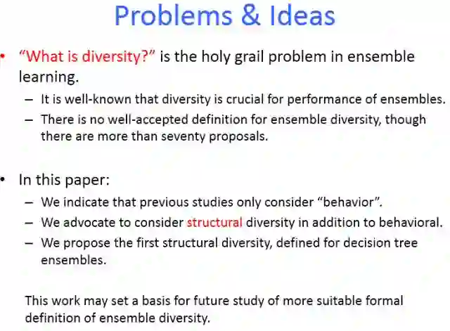 “为了构建一个泛化性能好的分类器集成,个体分类器需要具有较高的正确率和多样性。尽管有过很多尝试,多样性度量仍然是个谜。本文猜测以往的多样性度量之所以存在一些不足之处,是因为它们只考虑了分类器在做预测时预测行为间的差异,即行为多样性,而忽视了即使两个分类器预测结果相同,它们的结构也可能不同。”