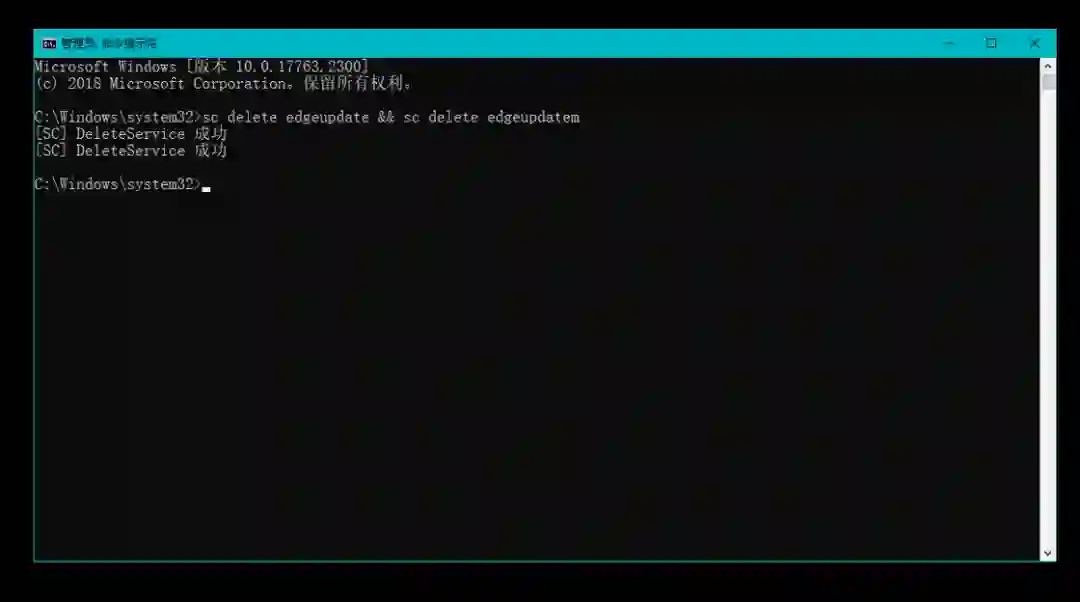 然后,我们需要删除两个执行 Edge 后台更新程序的系统服务。使用管理员权限打开命令提示符(搜索 CMD 可得),输入sc delete edgeupdate && sc delete edgeupdatem 以完全删除 Edge 更新服务。