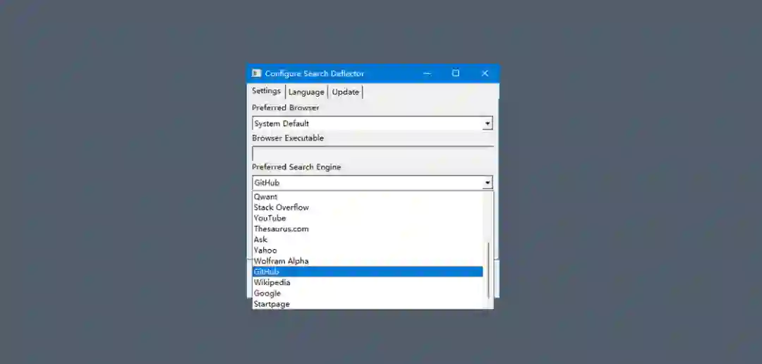 其一是前面提到的 Search Deflector,安装软件后,打开其设置,可以看到不同的搜索引擎: