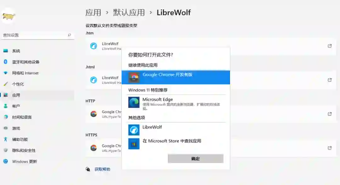 现版本如果想要切换某浏览器为默认,需要更多的步骤。假设我们想要将 Liberwolf 设定为默认浏览器,需打开设置面板,进入「应用 > 默认应用 > Liberwolf」,将 .html、.htm、HTTP 和 HTTPS 四个条目设置为 Liberwolf。