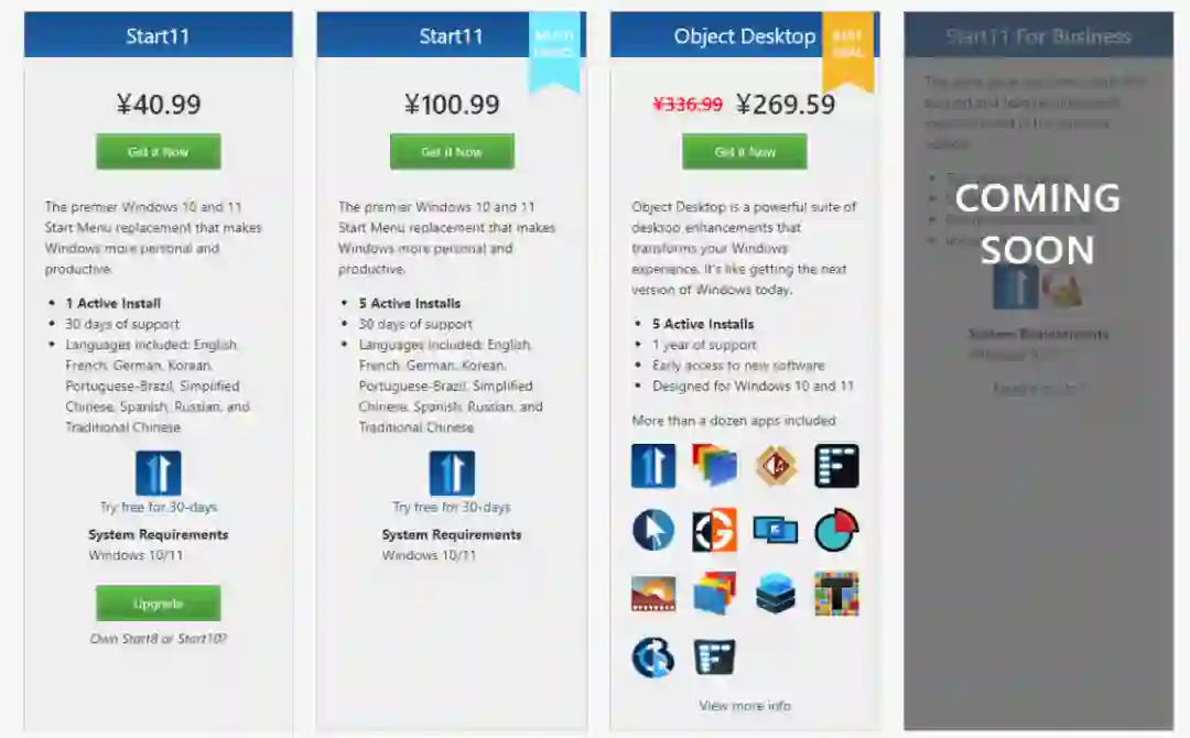 Start11 提供 30 天免费试用,单平台售价 ¥40.99,包含此软件、Stardock 旗下共计 14 款软件的 Object Desktop 组合包售价 ¥269.59。