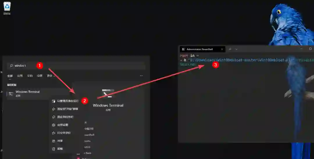 之后,以管理员权限打开 Windows Terminal(PowerShell 亦可),先键入 Set-ExecutionPolicy Unrestricted -Force 以获得执行本地脚本的权限。再粘贴刚刚得到的路径,在路径前输入 & ,在后面加上 -DisableBingSearches。最终的命令类似 & "D:\Downloads\Win10Debloat-master\Win10Debloat.ps1" -DisableBingSearches。回车键确认执行。重启电脑,Bing 就会被禁用。