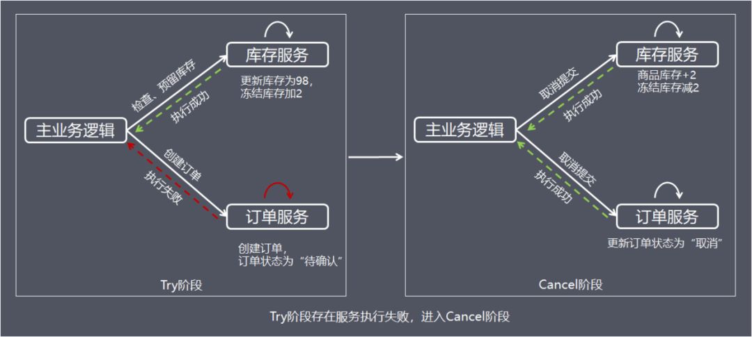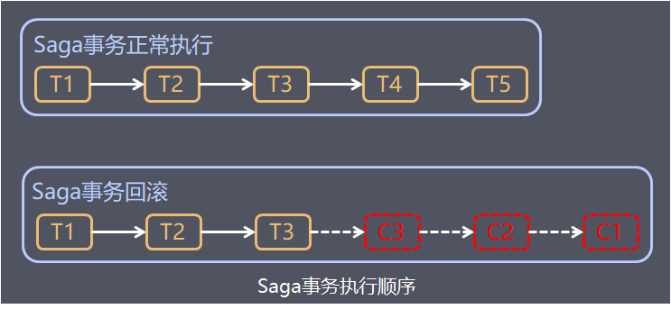 事务回滚:T1, T2, ..., Tj, Cj,..., C2, C1,其中 0 < j < n,例如:扣减库存(T1),创建订单(T2),支付(T3,支付失败),支付回滚(C3),订单回滚(C2),恢复库存(C1)。