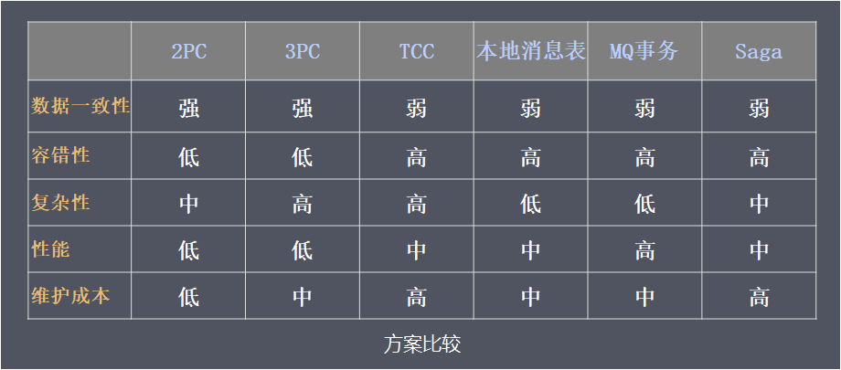 2PC/3PC:依赖于数据库,能够很好的提供强一致性和强事务性,但相对来说延迟比较高,比较适合传统的单体应用,在同一个方法中存在跨库操作的情况,不适合高并发和高性能要求的场景。