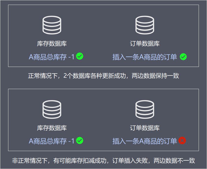 可以看到,如果多个数据库之间的数据更新没有保证事务,将会导致出现子系统数据不一致,业务出现问题。