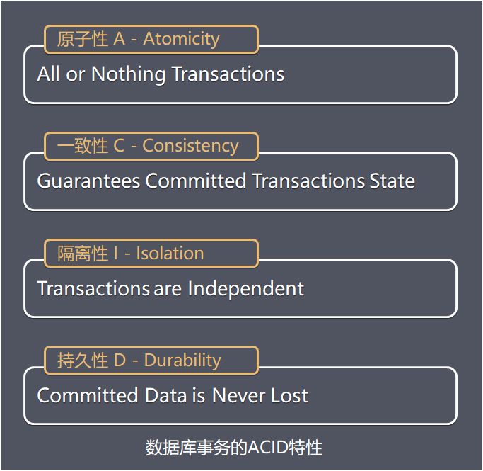 事务是基于数据进行操作,需要保证事务的数据通常存储在数据库中,所以介绍到事务,就不得不介绍数据库事务的 ACID 特性。