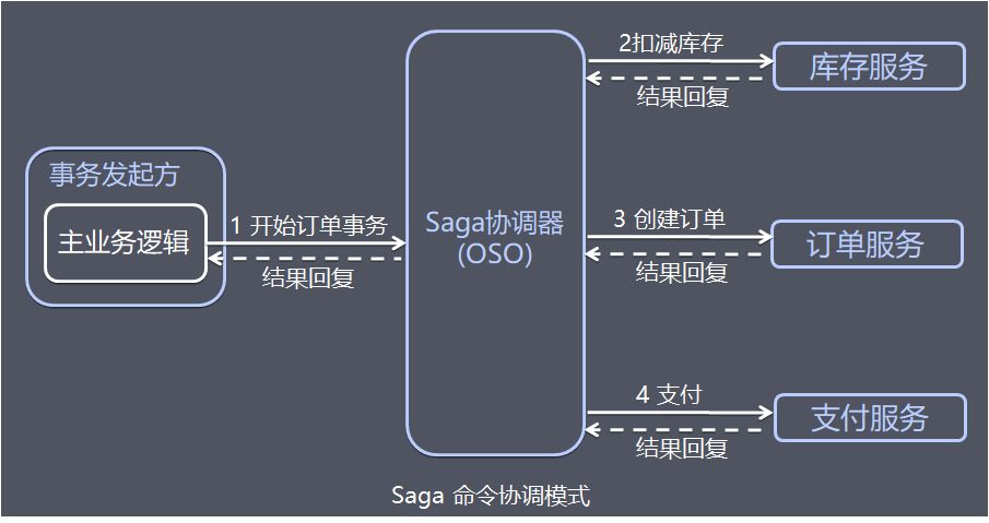 中央协调器(Orchestrator,简称 OSO)以命令/回复的方式与每项服务进行通信,全权负责告诉每个参与者该做什么以及什么时候该做什么。
