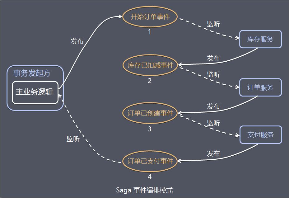 在事件编排方法中,第一个服务执行一个事务,然后发布一个事件。该事件被一个或多个服务进行监听,这些服务再执行本地事务并发布(或不发布)新的事件。